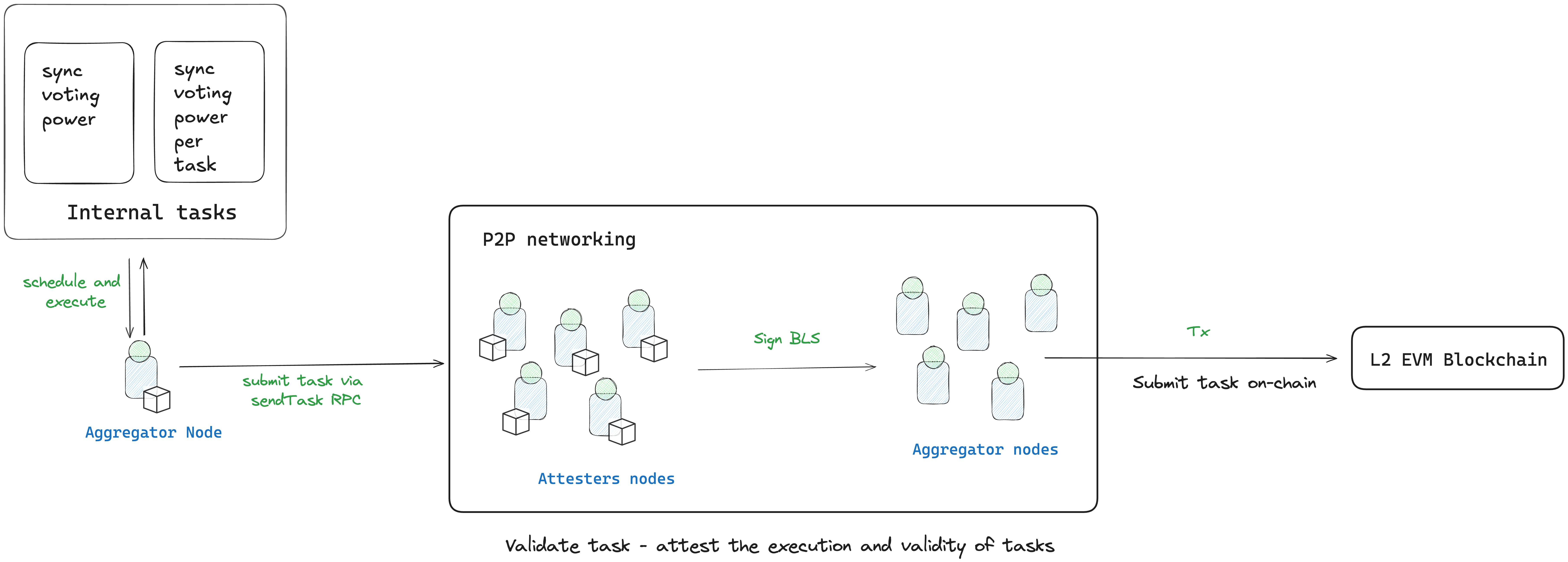 The execution and validation of internal tasks are facilitated by the same operator set and consensus engine used by the AVS, ensuring that they adhere to the same consensus standards as core AVS Tasks.
