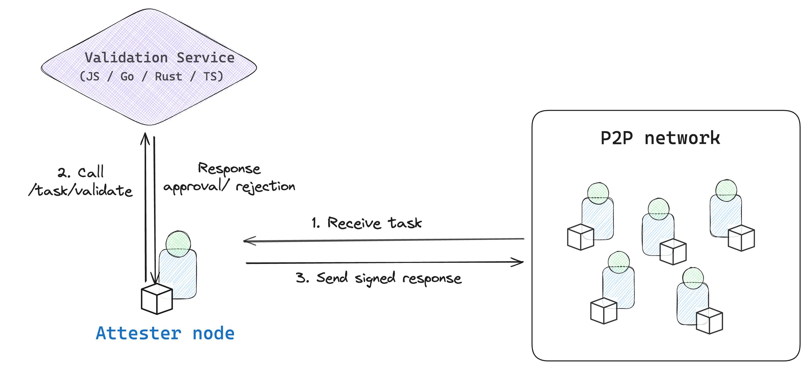 The **Validation Service** is responsible for task validation logic, locally run and called by the Attester nodes. It acts as a micro-service for validating tasks and can be written in **any programming language.**